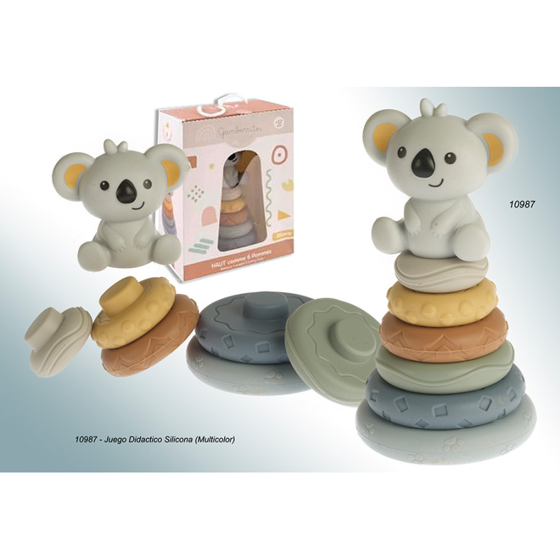 Juego didáctico infantil de silicona de la marca Gamberritos. Juguete infantil recomendado para +12 meses compuesto de aros apilables y Koala en la parte superior.